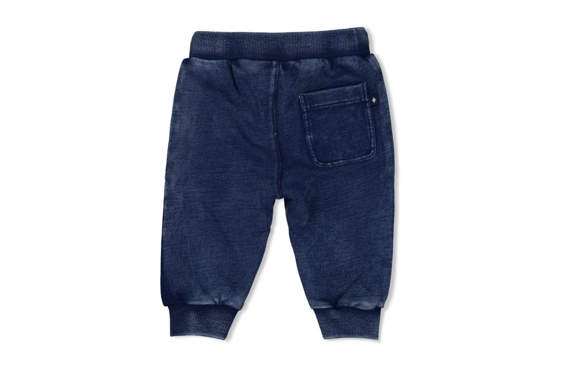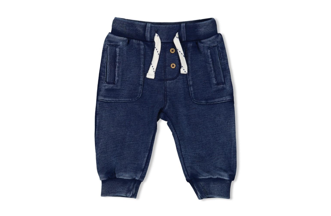 Binnen het Summer Denim thema is deze Feetje jongens broek een comfortabele keuze voor elke dag. De donkerblauwe sweatstof voelt prettig aan en beweegt soepel mee. De elastische tailleband met koord zorgt voor een aansluitende pasvorm die goed blijft zitten. De boorden onderaan geven het model een nette afwerking. Mooi te dragen met het gestreepte jongens T-shirt van Feetje uit dezelfde Summer Denim lijn voor een complete outfit.