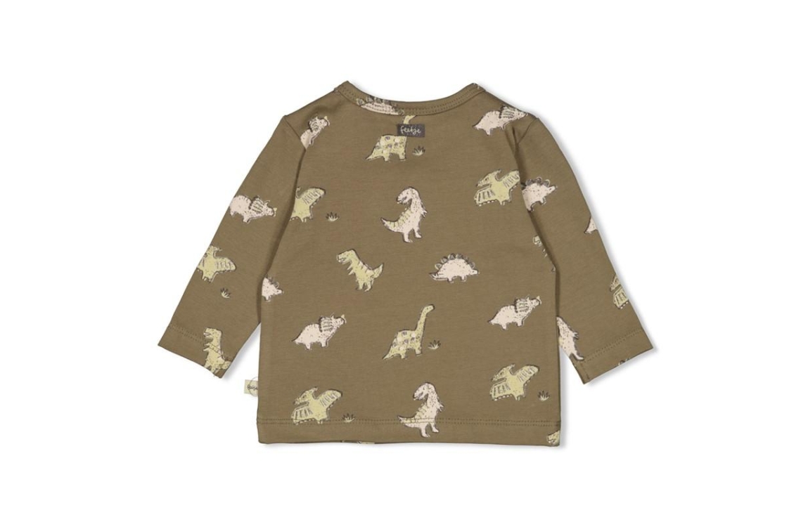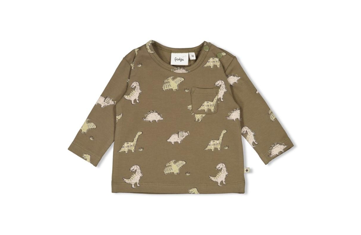 Deze longsleeve met all-over print heeft een stoere uitstraling dankzij de olijfgroene kleur. De stof bestaat uit 94% katoen en 6% elastaan, waardoor het shirt zacht en licht rekbaar aanvoelt. Perfect voor actieve dagen waarop comfort en bewegingsvrijheid belangrijk zijn. De print maakt de look speels en vrolijk, terwijl de kleur goed aansluit bij herfstige tinten. Combineer met een denim of ribbroek voor een outfit die zowel stijlvol als praktisch is. Een favoriet voor kleine avonturiers.