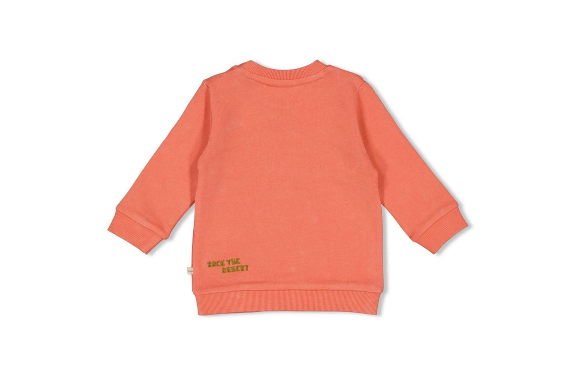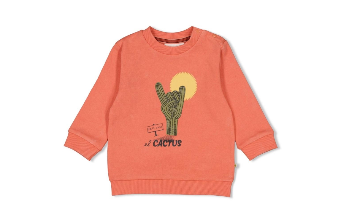 Deze koraalkleurige sweater brengt meteen dat Desert Fiesta gevoel in de kast. Op de voorkant staat een cactus print met zon, een echte blikvanger. De ribboorden bij hals, mouwen en zoom houden het model mooi in vorm. Dankzij de drukknoopjes op de schouder gaat aan en uit extra makkelijk bij de allerkleinsten.Desert Fiesta is er ook bij Sturdy in grotere maten, ideaal om broertjes in dezelfde sfeer te kleden.