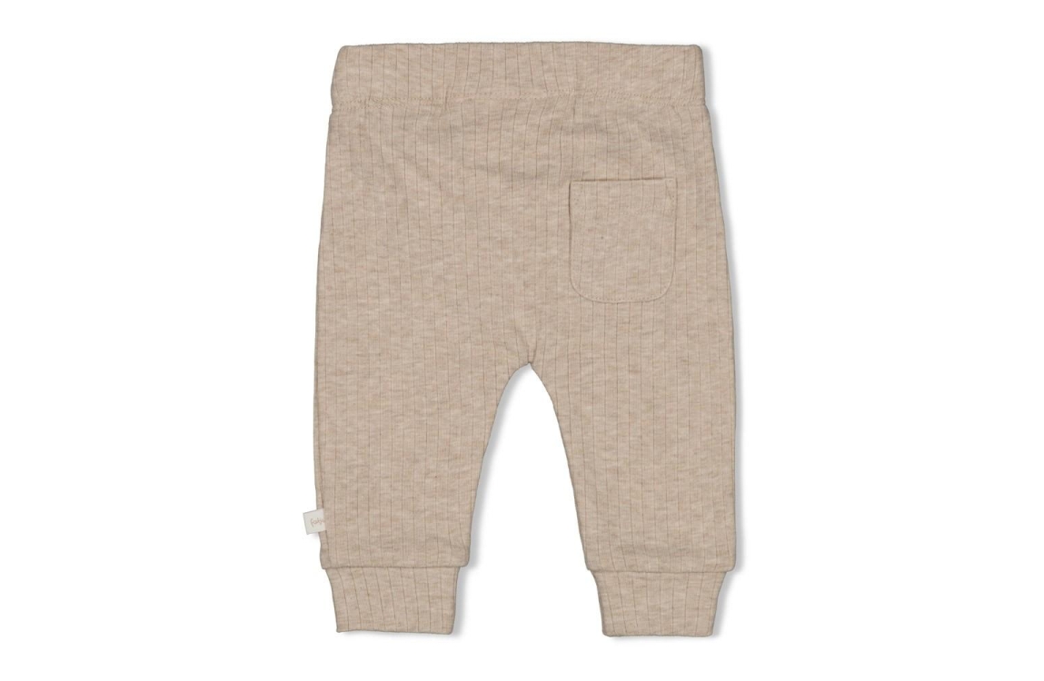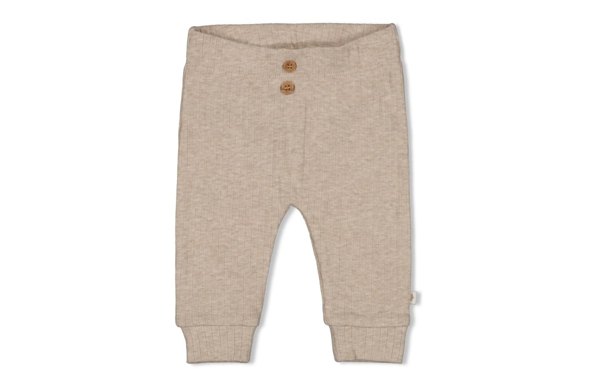 Unisex ribbroekje van Feetje in zandkleurige melange met twee sierknoopjes. De ribstof voelt zacht en soepel, met een brede tailleband. Voor newborns tot 6 maanden. Past goed in het olifantjes-thema en staat mooi bij een romper of shirt.