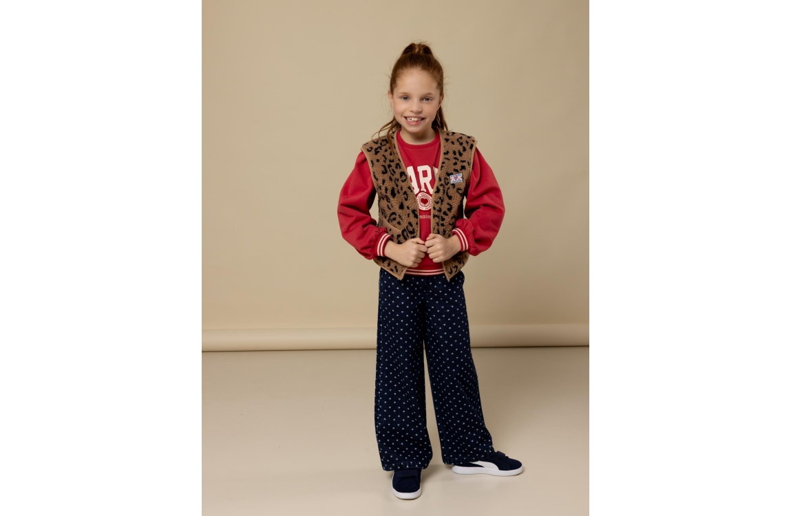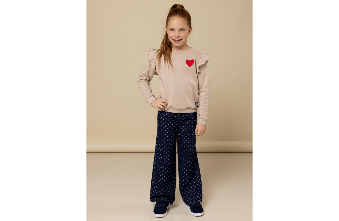 Hoe leuk zijn deze jeans met hartjesprint? De denim look krijgt een speelse twist met al die kleine hartjes. Gemaakt van 100% polyester voelt de stof stevig aan maar is hij toch licht en comfortabel. Perfect voor meisjes die houden van stoer met een knipoog. Combineer met een basic top of juist een vrolijke trui voor extra fun. Een eyecatcher die elke outfit laat sprankelen!